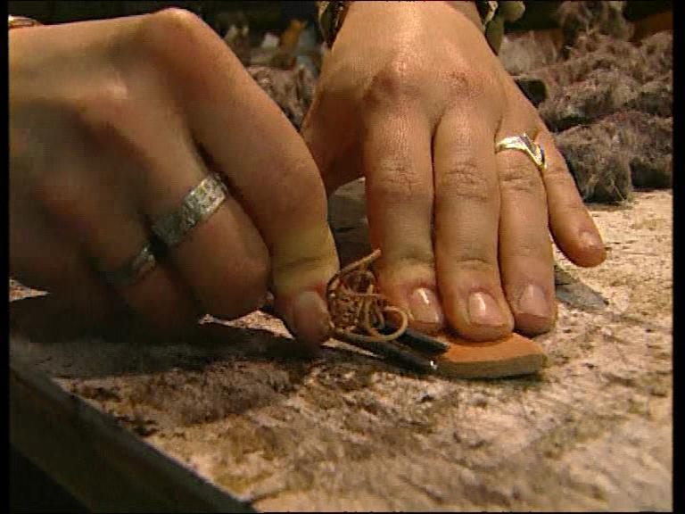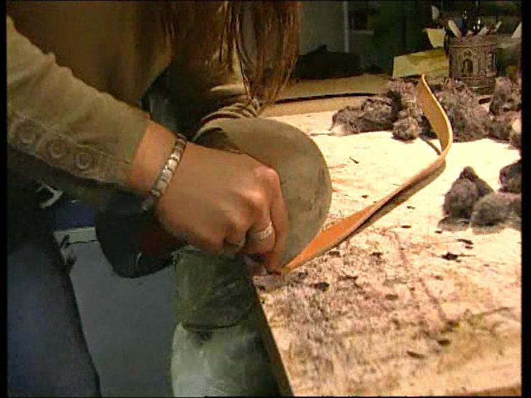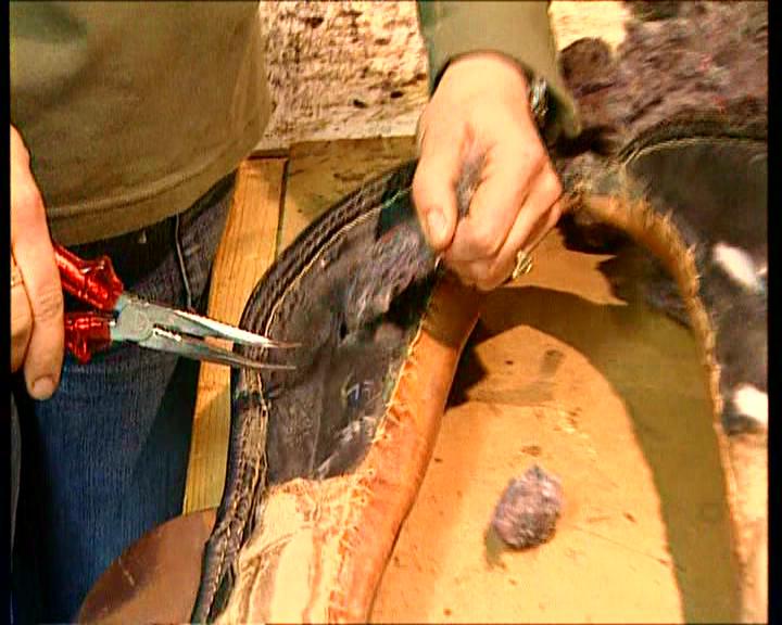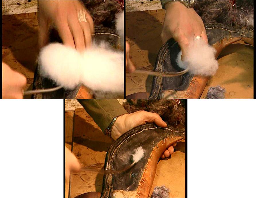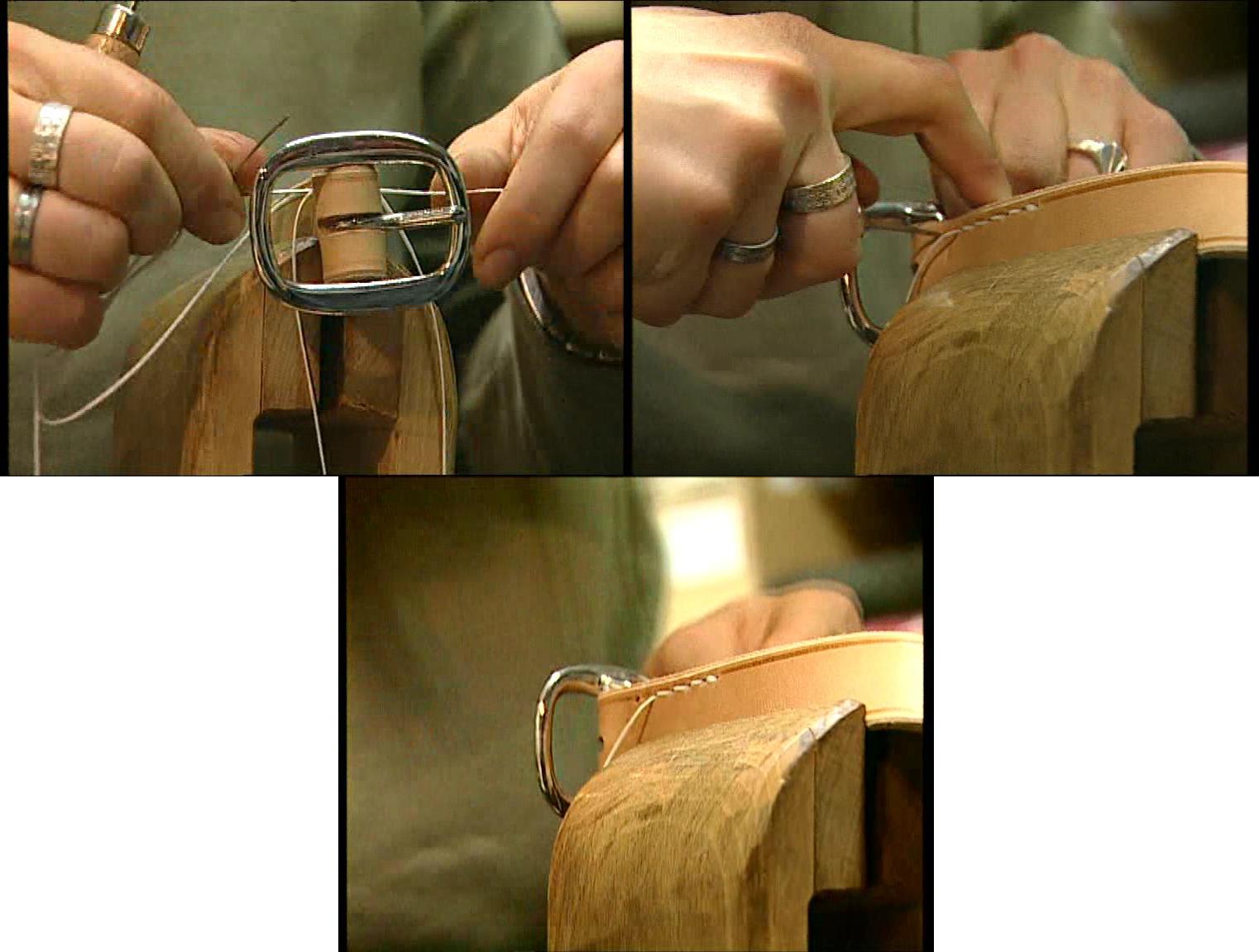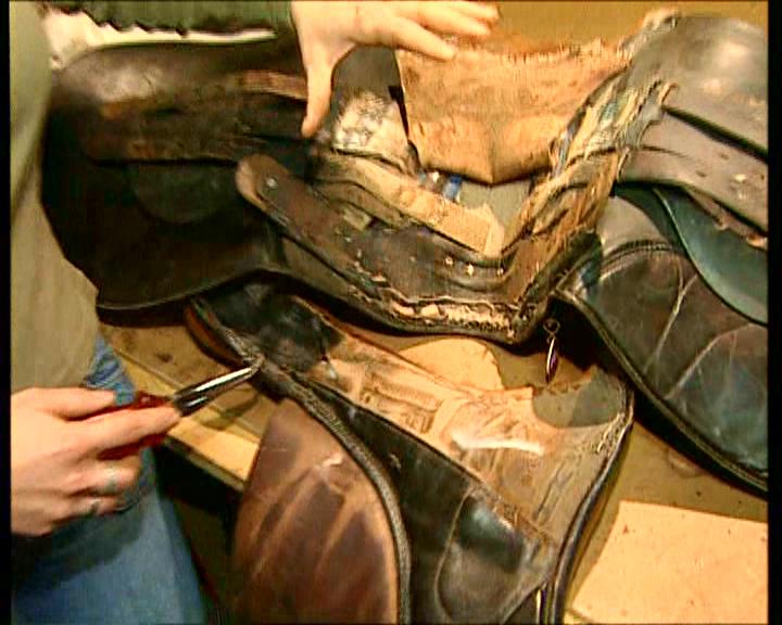 Ein geöffneter Sattel. Entfernen von dem alten Polstermaterial. Neupolstern mit neuer Füllwatte. Herstellung eines Gürtels. Zuschneiden des Gürtels mit einem Halbmond. Anschließend werden die Kanten abgezogen. Hier wird die Gürtelschnalle eingenäht. Zum Schluß werden die Gürtellöcher gestanzt. | ||||||||||||||||||||||